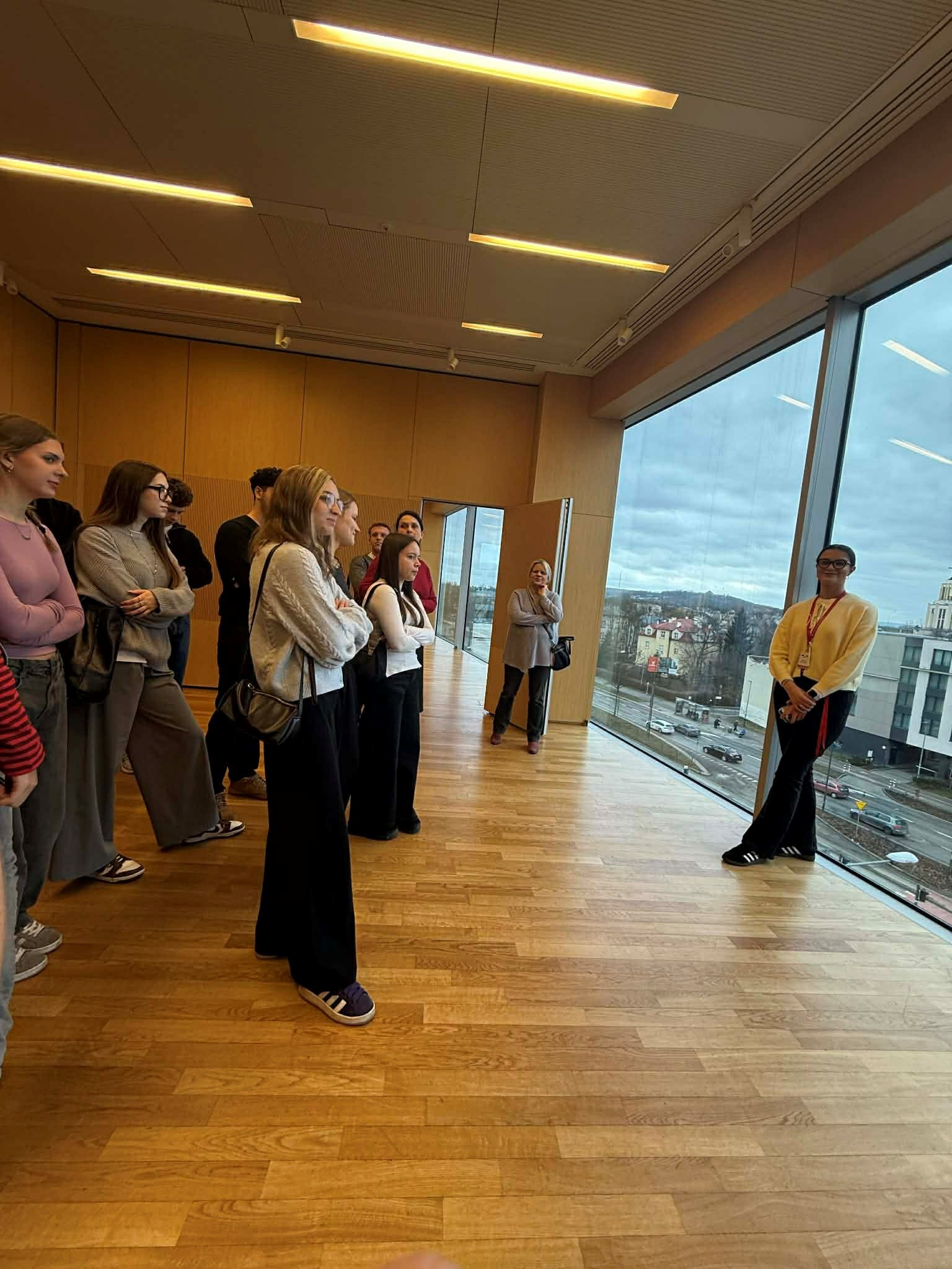 25 lutego 2026 r. studenci kierunku Zarządzanie Rekreacją i Rozrywką rozpoczęli cykl zajęć study tour. Pierwszym punktem programu była wizyta w ICE Kraków Congress Centre. Po obiekcie oprowadzała ich Pani Wiktoria Biel-Leśniak, Specjalistka ds. Sprzedaży, która przybliżyła studentom specyfikę funkcjonowania jednego z najnowocześniejszych centrów kongresowych w Polsce. Podczas wizyty studenci mieli okazję zwiedzić przestrzenie obiektu, w tym sale wielofunkcyjne, w których odbywają się najważniejsze wydarzenia kulturalne i biznesowe w Krakowie. Poznali również innowacyjne rozwiązania architektoniczne oraz akustyczne zastosowane w budynku. Pani Wiktoria podzieliła się także wiedzą na temat procesów sprzedaży, pozyskiwania wydarzeń oraz obsługi klienta biznesowego. Spotkanie było doskonałą okazją do poznania kulis zarządzania marką o międzynarodowym zasięgu oraz specyfiki funkcjonowania branży MICE. Wizyta stanowiła wartościowe doświadczenie edukacyjne i pozwoliła studentom lepiej poznać praktyczne aspekty pracy w sektorze przemysłu spotkań.