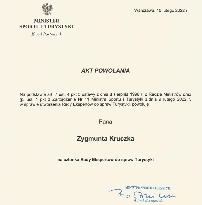 Jest nam miło poinformować, że Profesor Zygmunt Kruczek został powołany do Rady Ekspertów do spraw Turystyki przy Ministrze Sportu i Turystyki.