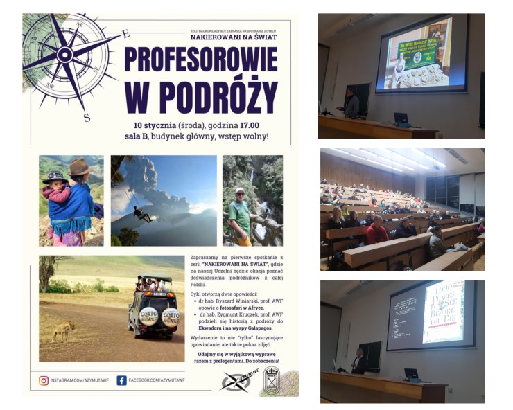 „Profesorowie w podróży”, to podróżnicze wspomnienia, w których Profesor Ryszard Winiarski zabrał słuchaczy na fotosafari do Tanzanii, były opowieści o Wielkiej Piątce, kalderze, Kilimandżaro, tanzanicie i wiosce Masajów; w impresjach z podróży do Ekwadoru Profesora Zygmunta Kruczka, słuchaliśmy historii o szamanach, równiku, wulkanach, herbacie z koki i żółwiach na Galapagos.