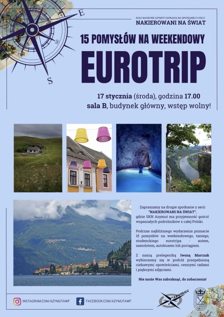 Zapraszamy na II spotkanie z cyklu „NAKIEROWANI NA ŚWIAT” pt. "15 pomysłów na weekendowy EUROTRIP", organizowane przez SKN Azymut AWF Kraków, które odbędzie się 17 stycznia, o godz. 17:00, w sali B.p
