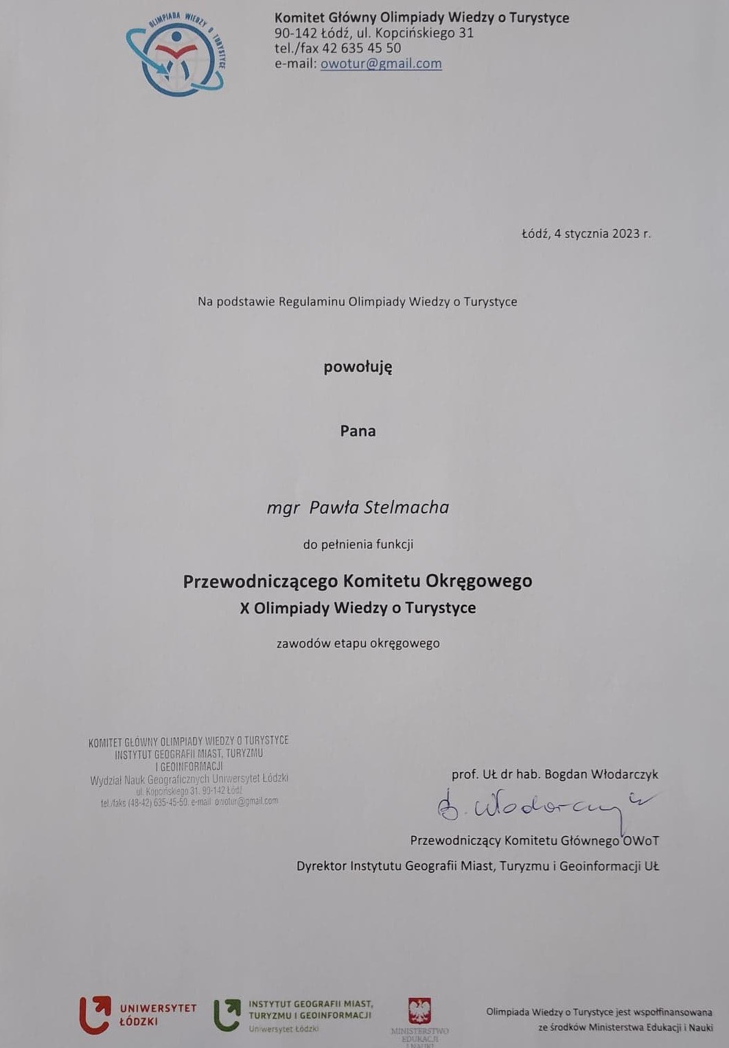 Jednym z rezultatów wieloaspektowych kontaktów i współpracy Instytutu Przedsiębiorczości i Zarządzania AWF Kraków z Instytutem Geografii Miast, Turyzmu i Geoinformacji Wydziału Geograficznego Uniwersytetu Łódzkiego było powołanie i pełnienie przez mgra Pawła Stelmacha funkcji Przewodniczącego Komitetu Okręgowego X Olimpiady Wiedzy o Turystyce w Bielsku-Białej w dniu 4 stycznia 2023 r. Jubileuszowa olimpiada jest organizowana pod hasłem "Turystyka miejska - w miejskiej dżungli". W Bielskim Centrum Edukacji odbył się etap okręgu drugiego olimpiady, obejmującego swoim zasięgiem województwo śląskie. Warto podkreślić wysoki poziom merytoryczny i organizacyjny zawodów. Gorąco zachęcamy uczniów szkół średnich do udziału w kolejnych edycjach Olimpiady Wiedzy o Turystyce. Szczegółowe informacje na temat olimpiady na stronie https://www.geo.uni.lodz.pl/popularyzacja/owot#