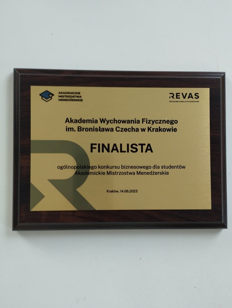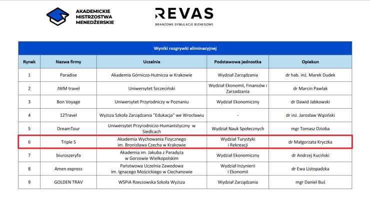 Do eliminacji Mistrzostw Menedżerskich zorganizowanych przez firmę Revas przystąpiły 74 zespoły z 65 uczelni z całej Polski. Studenci przez ponad miesiąc sprawdzali swoją wiedzę z dziedziny biznesu i zarządzania grając w symulację Biuro podróży. Do finału zakwalifikowało się 9 najlepszych zespołów, wśród których znalazł się zespół z naszej uczelni kierowany przez dr Małgorzatę Kryczkę (Instytut Przedsiębiorczości i Zarządzania, Wydział Turystyki i Rekreacji) w składzie: Adrian Szczypka, Marcin Zając i Kacper Tworzydło (studenci II roku TiR, specjalność E- Turystyka). Wielki finał odbył się 14.06.2023 roku w Krakowskim Parku Technologicznym. Drużyny rywalizowały o tytuł najlepszego wirtualnego menedżera podejmując decyzje biznesowe w rozszerzonej symulacji Agencji interaktywnej.