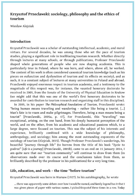 Wśród tej prawdziwej światowej elity badaczy i teoretyków turystyki znalazł się jeden Polak, którym jest Profesor Krzysztof Przecławski. Jego biogram naukowy oraz charakterystykę wkładu w rozwój wiedzy o turystyce, w postaci obszernego rozdziału zamieszczonego w trzecim tomie książki, napisał dyrektor Instytutu Przedsiębiorczości i Zarządzania AWF w Krakowie – prof. Wiesław Alejziak.