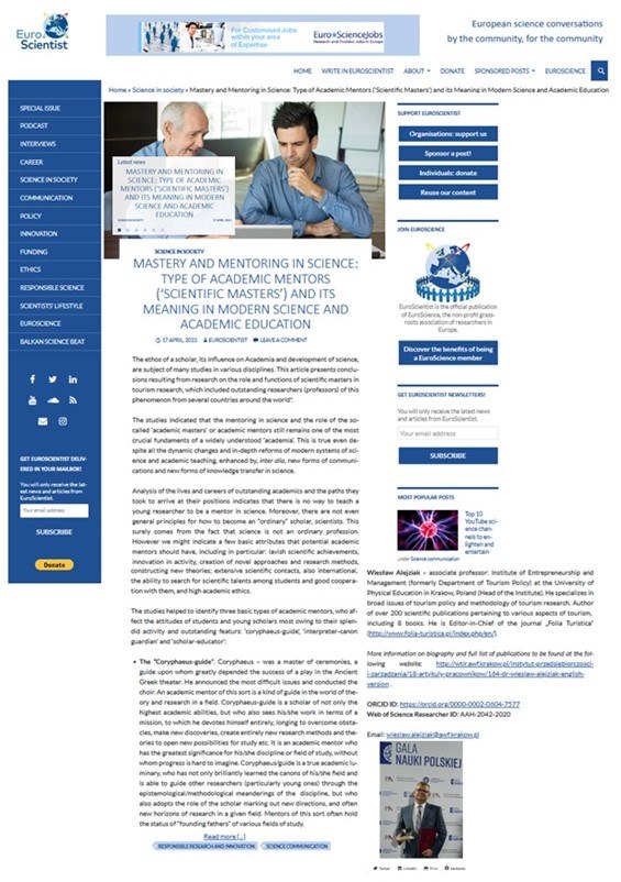 Miło nam poinformować, że w prestiżowym i opiniotwórczym czasopiśmie „EuroScientist” ukazał się właśnie artykuł prof. Wiesława Alejziaka na temat mistrzostwa i mentoringu w nauce, a także typów mistrzów naukowych i ich znaczenia we współczesnej nauce i edukacji akademickiej („Mastery and Mentoring in Science: Type of Academic Mentors (‘Scientific Masters’) and its Meaning in Modern Science and Academic Education).