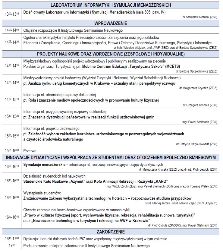 Przygotowania do Seminarium były koordynowane przez dra Piotra Cybulę, a obrady prowadził dr hab. Wiesław Alejziak, prof. AWF. Na program Seminarium złożyło się łącznie 9 referatów. Siedem z nich zostało wygłoszonych przez pracowników wszystkich czterech Zakładów funkcjonujących w IPiZ. W tej części spotkania szczególnie wart odnotowania był fakt wystąpienia trzech osób, które stosunkowo niedawno podjęły pracę w naszej Uczelni (dr Iwona Cybula, mgr Ewa Kopeć, mgr Marcin Widomski). Dwa referaty zostały z kolei zaprezentowane przez czworo studentów reprezentujących prężnie działające pod kierunkiem mgra Pawła Stelmacha SKN „E-zarządzania w Turystyce i Rekreacji”. Te dwa wystąpienia przykuły uwagę nie tylko oryginalną tematyką (apiterapia realizowana na rzecz rozwoju turystyki, zwłaszcza zdrowotnej), ale zwłaszcza profesjonalnym przygotowaniem młodych naukowców. Nazwiska prelegentów oraz tytuły ich wystąpień przedstawiono na poniższej grafice.