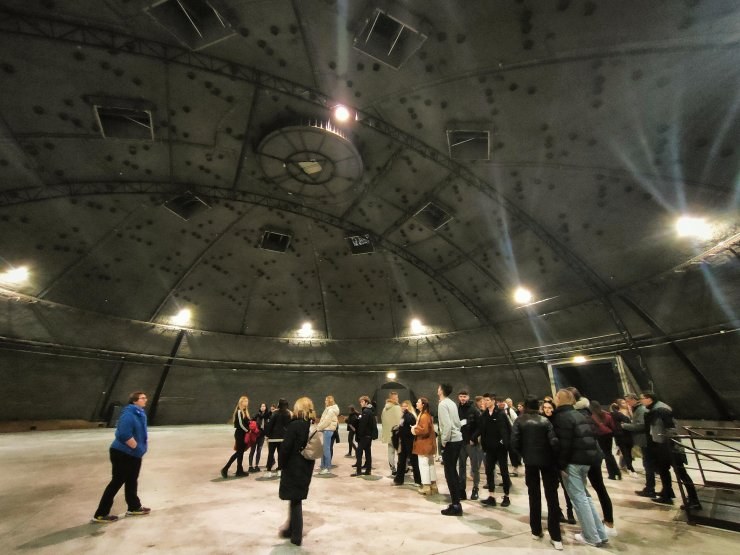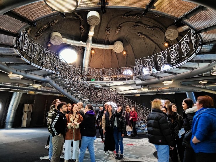 Kolejnym punktem na naszej liście, które odwiedziliśmy w ramach zajęć Organizacja eventów - study tour była wizyta w studio filmowym Alvernia Planet, która odbyła się 2 marca 2023 r. Miejsce to było absolutnie spektakularne i oryginalne pod każdym względem. Dużą uwagę przykuwa wygląd architektoniczny budynku. Ogromne kapsuły, które swoim kształtem przypominały planety wyłaniające się spod powierzchni ziemi, natomiast ich wnętrze to absolutna inspiracja światem obcych. Wszystko to robiło na nas duże wrażenie. Wraz z Panią Prezes Alverni, która była naszym przewodnikiem tego dnia, udaliśmy się w krótką podróż po wszystkich zakamarkach budynku. Byliśmy do tego stopnia ciekawi, że chcieliśmy wejść dosłownie wszędzie, natomiast Pani Prezes głośno zakomunikowała nam: "Tam nie! Tam ludzie pracują..." ߘ預odczas spaceru po kapsułach dowiedzieliśmy się jakie produkcje filmowe były realizowane w studio, jak wygląda proces przygotowania planu filmowego i jak długo on trwa, jak przebiegają nagrywki do kręcenia danych scen, jak również dotarliśmy do kapsuły, która w ubiegłym roku uległa pożarowi podczas kręcenia filmu. Pani Prezes odpowiedziała nam na wszystkie zadane przez nas pytania, a było ich - jak zwykle - dość sporo.