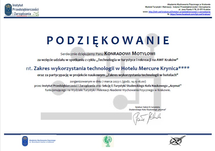 Spotkanie w relacji studenta Pawła Rąpały: 7.03.2023 - ten dzień na pewno na długo zapadnie w pamięci studentom II roku Turystyki i Rekreacji o specjalności "e - turystyka", za sprawą wyjątkowego spotkania z General Manager'em HOTEL MERCURE KRYNICA ZDRÓJ RESORT & SPA**** - Panem Konradem Motylem w ramach przedmiotu "e - rynek jako środowisko funkcjonowania uczestników rynku turystycznego". Spotkanie to miało na celu przybliżenie nam tematu technologii wykorzystywanych w hotelu. Kolejne nudne spotkanie? Nic z tych rzeczy! Merytoryka, cenna wiedza a przede wszystkim skonfrontowanie się z zadawanymi przed studentów pytaniami oraz wspólna wymiana doświadczeń - wszystko to, zostało nam zagwarantowane na najwyższym poziomie i będzie to na pewno cenna lekcja na przyszłość, za co jeszcze raz dziękujemy.