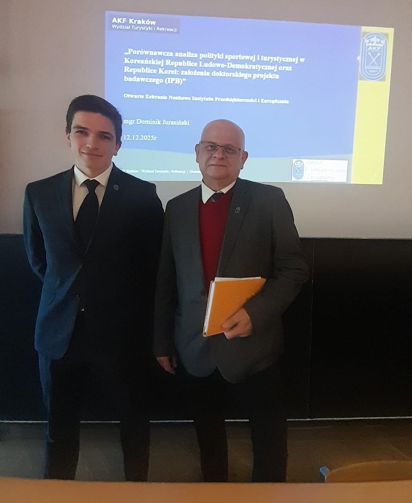 W dniu 12.12.2025 r. odbyło się Otwarte Zebranie Naukowe Instytutu Przedsiębiorczości i Zarządzania. W ramach tego spotkania mgr Dominik Jurasiński (Zakład Ekonomii i Zarządzania oraz Szkoła Doktorska NoKF) przedstawił założenia swojego projektu ukierunkowanego na przygotowanie rozprawy doktorskiej. Tytuł wystąpienia był następujący: „Porównawcza analiza polityki sportowej i turystycznej w Koreańskiej Republice Ludowo-Demokratycznej oraz Republice Korei: założenia doktorskiego projektu badawczego (IPB)”. Zebranie miało więc charakter typowo naukowy, w związku z czym po wystąpieniu Prelegenta nastąpiła dyskusja związana z przedstawionym tematem oraz projektem badawczym. Poniżej zdjęcie Prelegenta z Dyrektorem IPiZ, pełniącym jednocześnie funkcję promotora wspomnianej rozprawy doktorskiej.