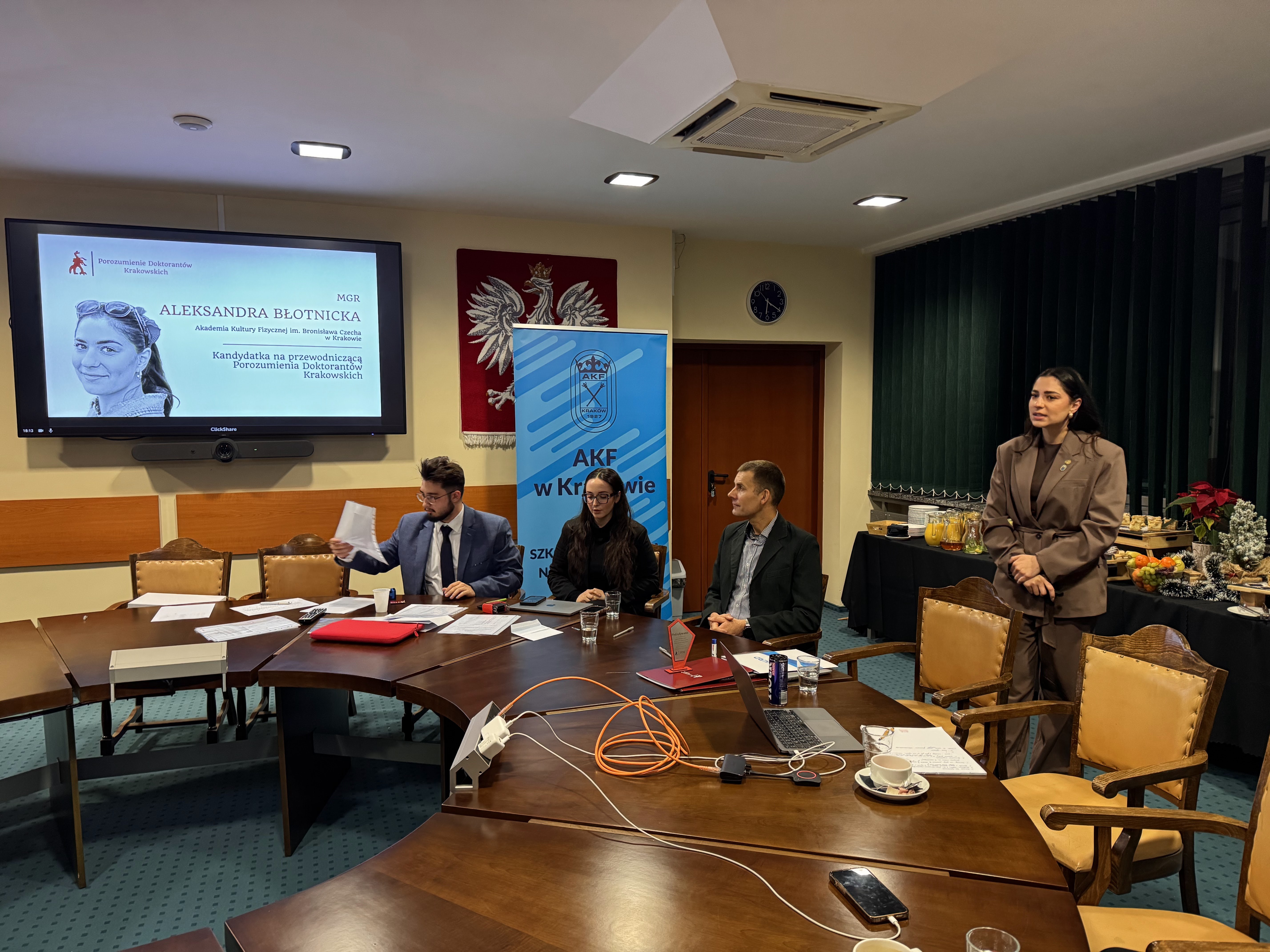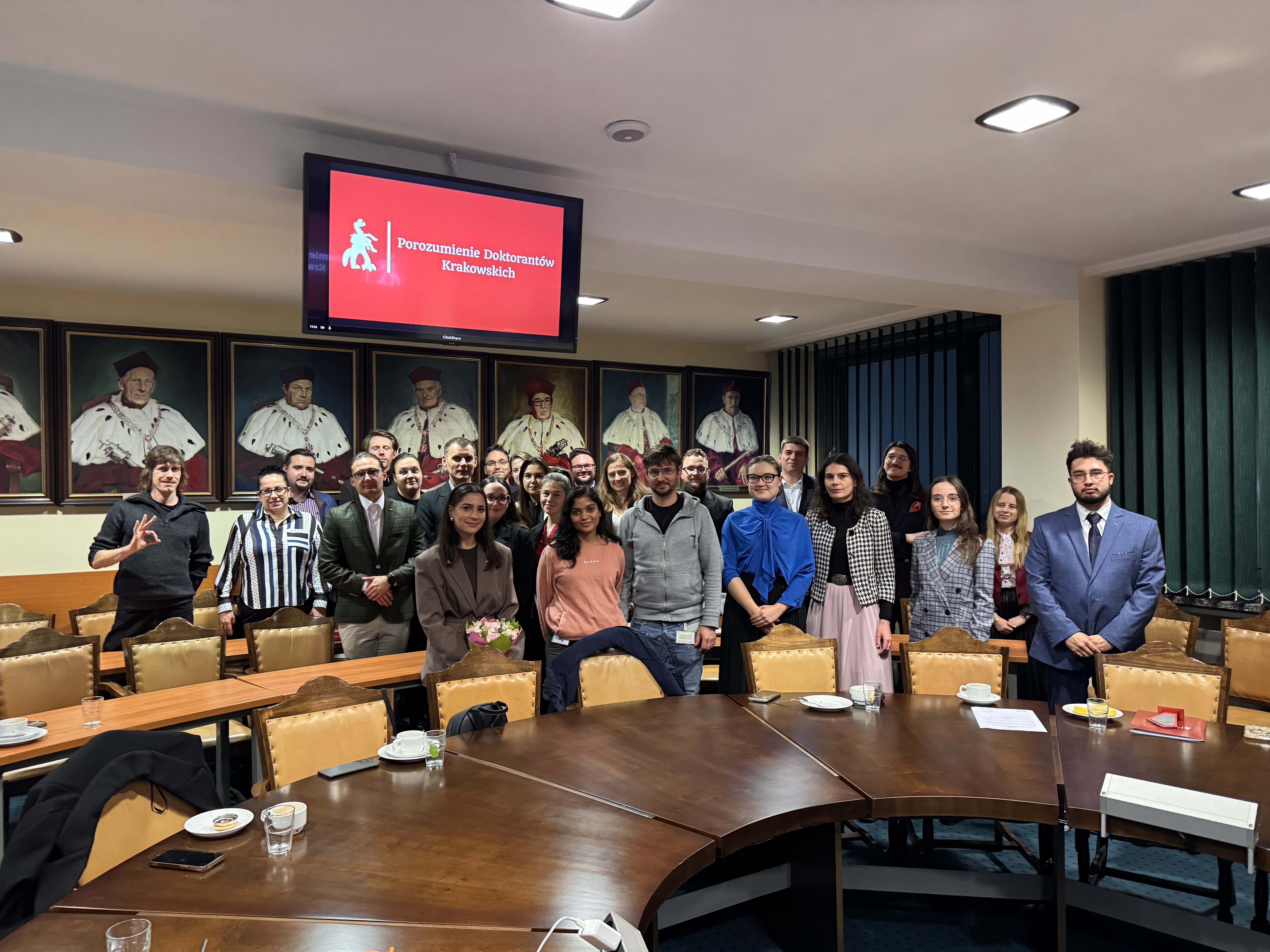 4 grudnia 2025 r. w murach naszej Uczelni odbył się IV Zjazd Porozumienia Doktorantów Krakowskich. W toku obrad przyjęto nowych członków (Samorządy Doktorantów Instytutu Farmakologii im. J. Maja PAN, Uniwersytetu Ekonomicznego w Krakowie oraz Akademii Sztuk Pięknych im. J. Matejki w Krakowie), dzięki czemu PDK stało się największym lokalnym porozumieniem. Kulminacyjnym elementem spotkania była jednak prezentacja kandydatów i przeprowadzenie wyborów przewodniczącego oraz pozostałych członków Zarządu na kadencję 2026. Z radością pragniemy poinformować, że na stanowisko Przewodniczącej PDK została wybrana mgr Aleksandra Błotnicka, pracownica IPiZ (Zakład Ekonomii i Zarządzania).