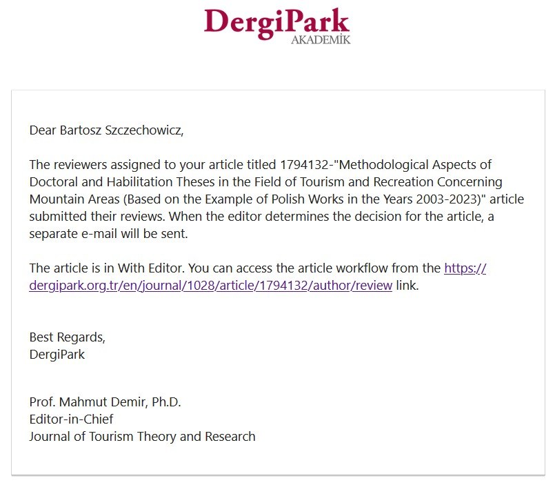 W procedurach recenzenckich jest też artykuł pt. Methodological Aspects of Doctoral and Habilitation Theses in the Field of Tourism and Recreation Concerning Mountain Areas (Based on the Example of Polish Works in the Years 2003-2023), złożony do czasopisma “Journal of Tourism Theory and Research”.