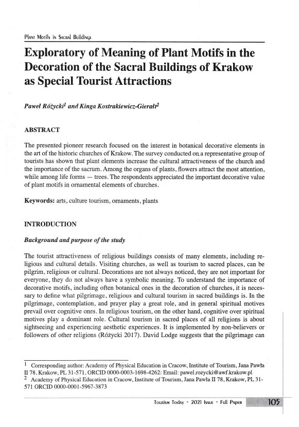 Na łamach czasopisma "Tourism Today", ukazał się artykuł na temat postrzegania przez turystów elementów roślinnych w wystroju obiektów sakralnych Krakowa. Artykuł został przygotowany przez prof. Pawła Różyckiego i prof. Kingę Kostrakiewicz-Gierałt.
