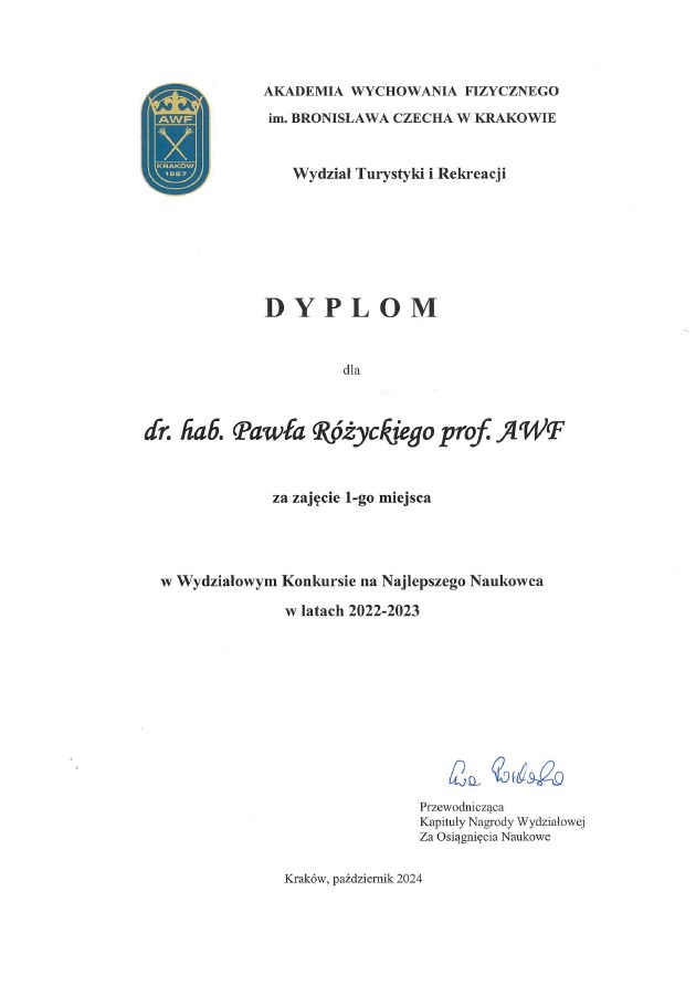 Miło nam poinformować, że Dyrektor Instytutu Turystyki dr hab. Paweł Różycki prof. AWF, zajął pierwsze miejsce w Wydziałowym Konkursie na Najlepszego Naukowca w latach 2022-23.
