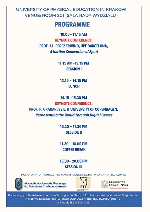 12 Maja 2023 w Akademii Wychowania Fizycznego w Krakowie odbędzie się międzynarodowa konferencja naukowa „Philosophical and Legal Aspects of the Definition of Sport”. Obrady będą się odbywać w języku angielskim, a ich tematem będą różnorodne zagadnienia związane z filozofią gier oraz sportu, ze szczególnym uwzględnieniem problematyki definicji sportu. Gośćmi honorowymi konferencji będą Profesor Jose Luis Pérez-Triviño z Uniwersytetu Pompeu Fabra w Barcelonie oraz Profesor Paweł Grabarczyk z Uniwersytetu IT w Kopenhadze. Serdecznie zapraszam do udziału w obradach.