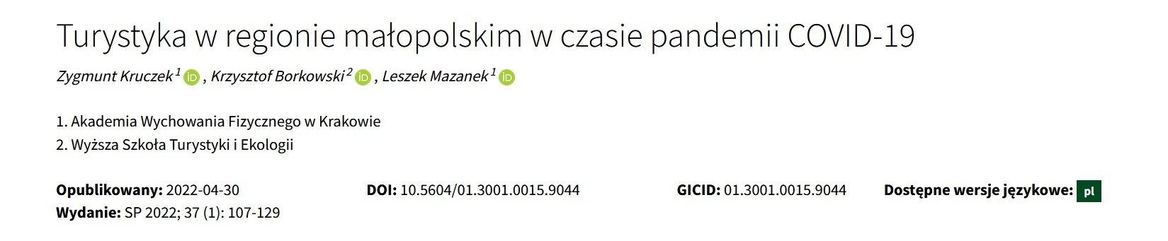 1. Kruczek, Z., Szromek A.R. & Michał Żemła (2022): Attitudes towards development of tourism among young citizens of a tourism city. Journal of Tourism and Cultural Change