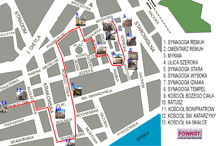 Krakowski Kazimierz obfituje w zabytki, które związane są z kulturą polską i żydowską. My proponujemy wycieczkę "palcem po mapie", trasą pokazaną na poniższym planie i zawierającą